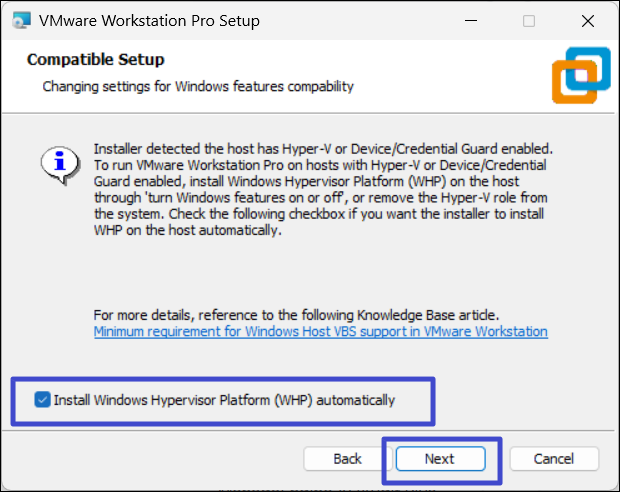 4. Se richiesto, seleziona "Installa automaticamente la piattaforma Hypervisor (WHP)”opzione e fare clic su "Prossimo“.