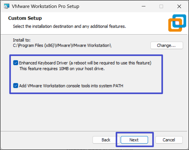 5. Puoi scegliere di installare “Driver della tastiera migliorato..." E "Aggiungi gli strumenti della console VMware Workstation al PERCORSO del tuo sistema”selezionando le caselle.