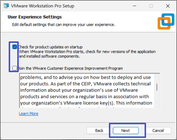 6. Puoi anche scegliere di abilitare o disabilitare il "Controlla gli aggiornamenti del prodotto all'avvio”E "Partecipa al programma di miglioramento dell'esperienza cliente VMware" opzioni. Quindi, fare clic su "Avanti".