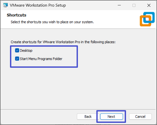 7. Controlla il “Desktop" E "Menu Start Cartella del programma”opzioni e fare clic su "Prossimo“.