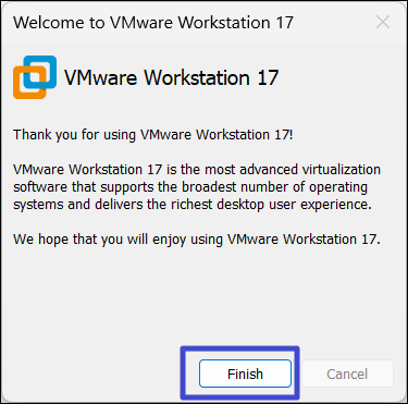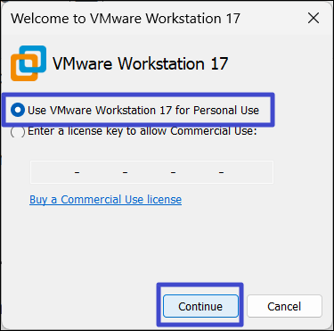 11. Dopo il riavvio, scegli "Utilizza VMware Workstation 17 per uso personaleopzione.