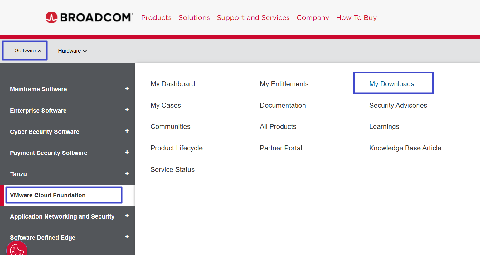 6. Apri il "Software", fare clic“VMware Cloud Foundation”e fare clic su "I miei download”sulla destra.
