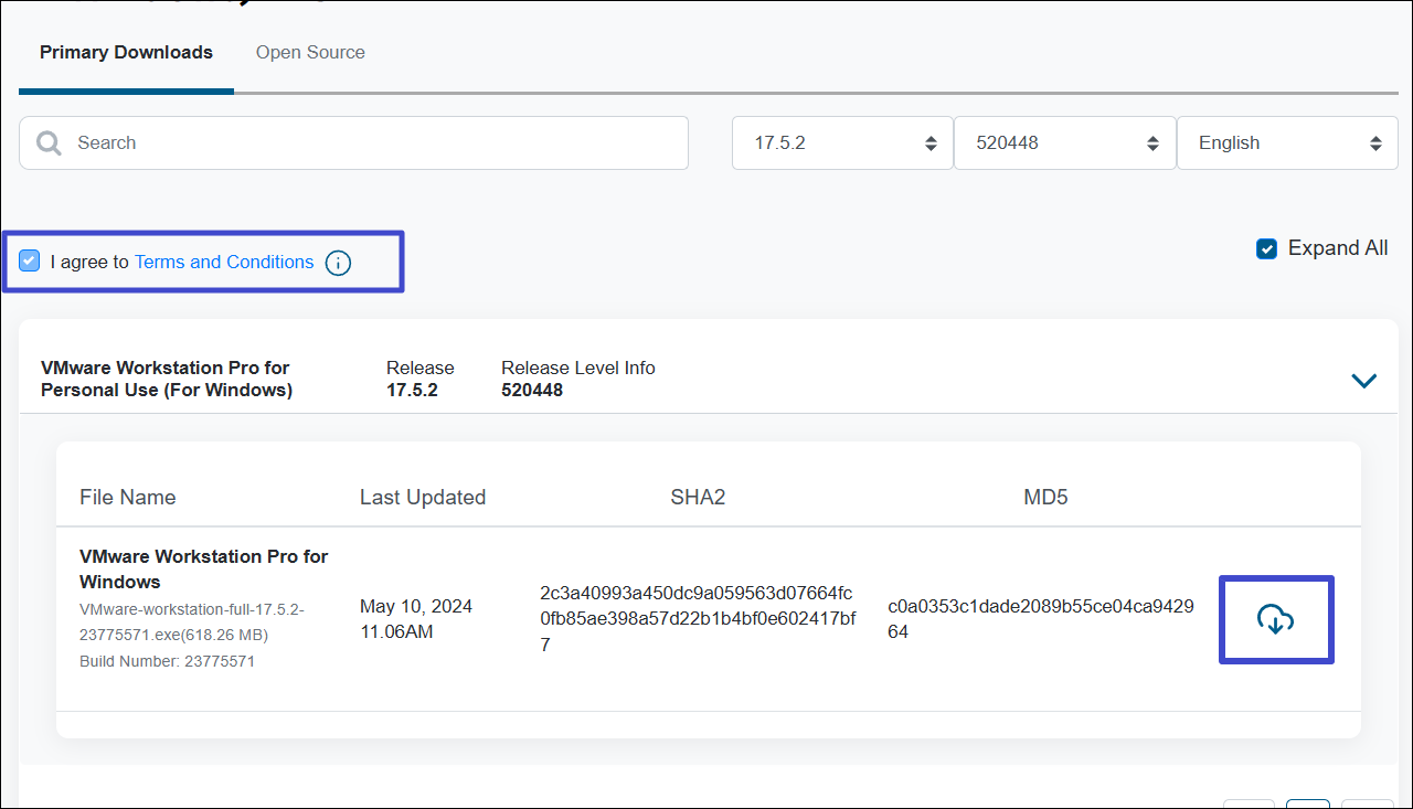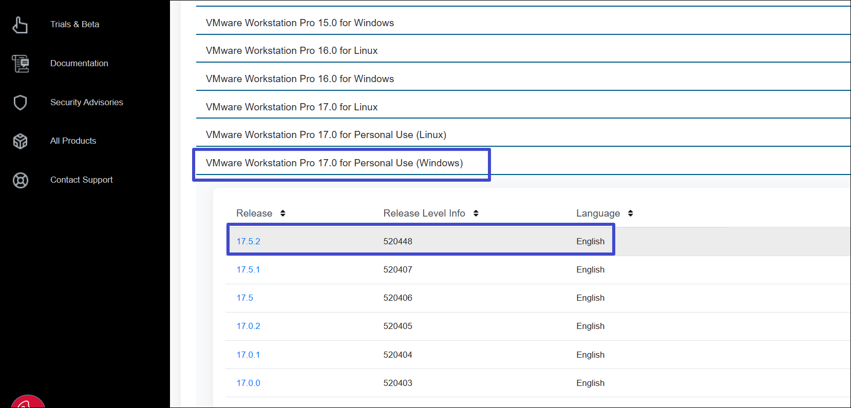 8. Fare clic su "VMware Workstation Pro 17.0 per uso personale (Windows)" e seleziona l'ultima versione disponibile, ad esempio17.5.2.