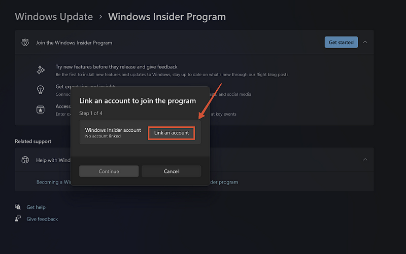 6.Quindi, ti verrà chiesto di scegliere il canale Insider. Qui puoi selezionare ilCanale di anteprima della versionee fare clic suPulsante Continuaprocedere.