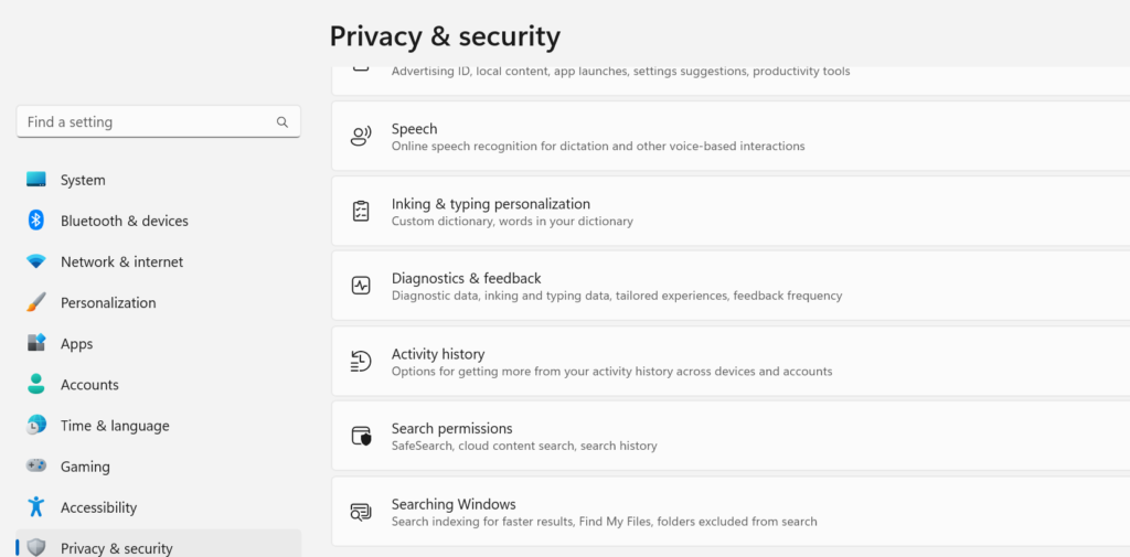 Passaggio 2:Dalla barra laterale di sinistra, selezionaPrivacy e sicurezza.