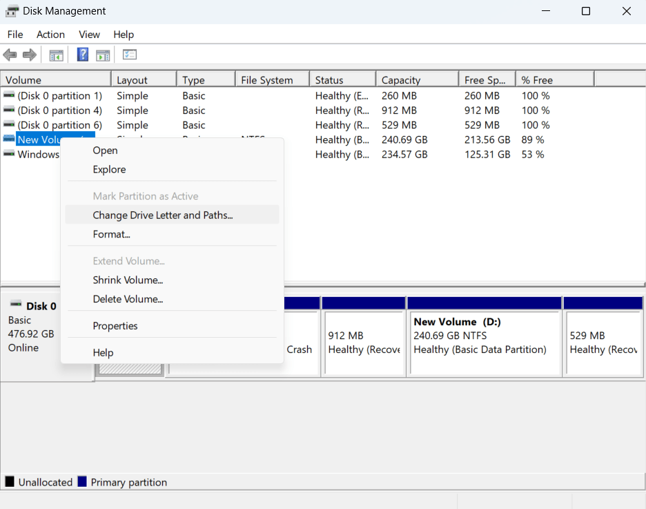 Passaggio 3 –Individua l'unità a cui desideri assegnare la lettera. Fare clic con il tasto destro su di esso e selezionareCambia lettera e percorso di unità.