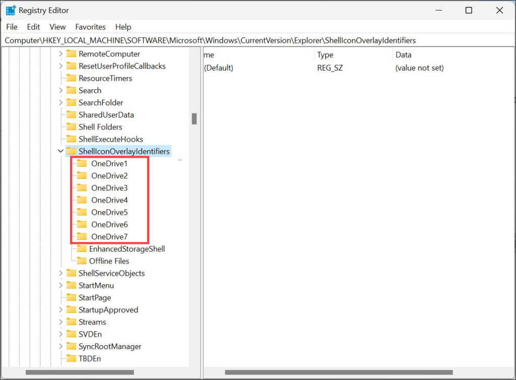 5.Sotto ShellIconOverlay, uno per uno, elimina il fileOneDrive1, OneDrive2e così via finché non elimini il segno di spunta verde.