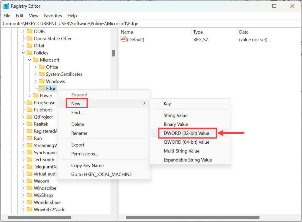 5.Ora, fai clic con il pulsante destro del mouse sulla chiave Edge appena creata e selezionaNuovo->Valore DWORD (32 bit).NominaloHubSidebarAbilitato.