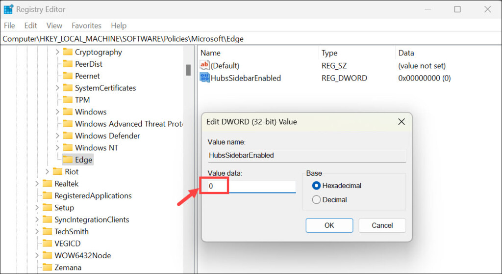6.Fare doppio clic su HubsSidebarEnabled e impostarloValore dati su 0se non lo è già.