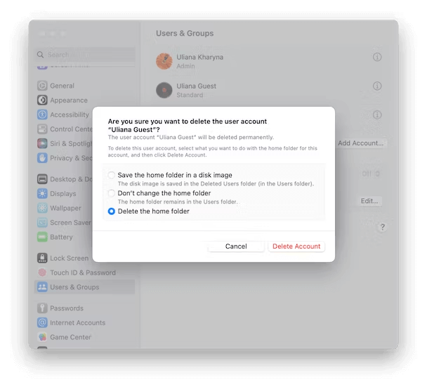 Passaggio 3:Fare clic suioaccanto a tutti i profili che non hai creato e scegli Elimina account. Dal popup, scegli Elimina la cartella Inizio.