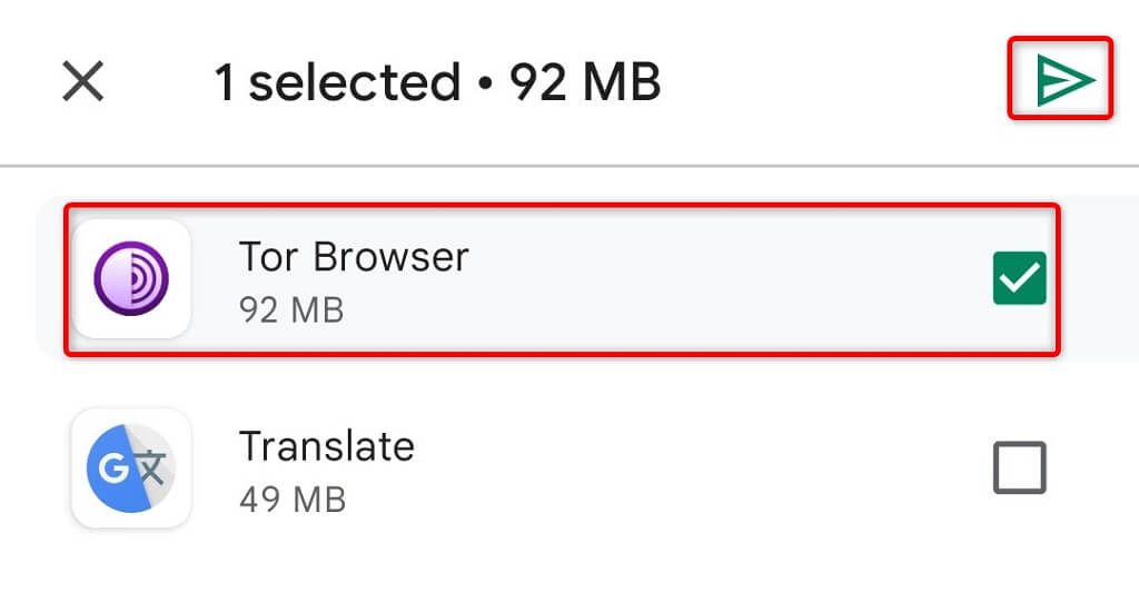 - Vedrai le tue app installate. Qui, seleziona le app che desideri condividere e tocca l'icona dell'aeroplanino di carta nell'angolo in alto a destra.