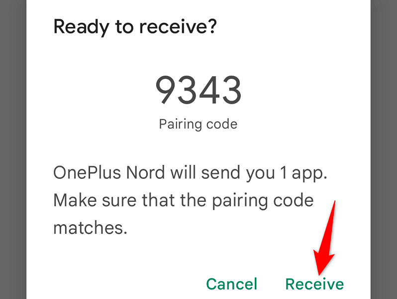 - Abbina il codice di abbinamento su entrambi i telefoni e toccaRiceveresul telefono del destinatario.