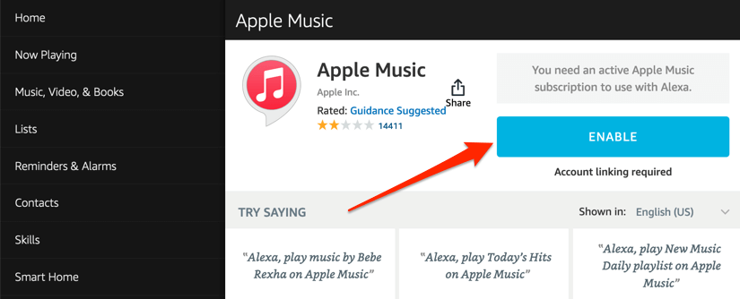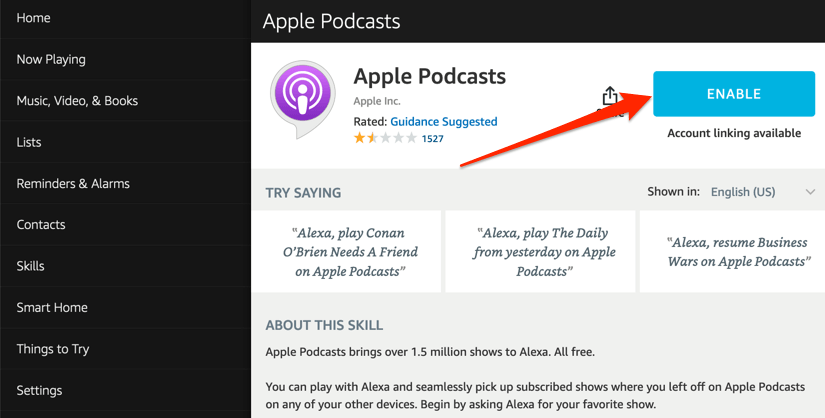 - RubinettoAbilita all'usoper aggiungere podcast Apple ad Alexa.