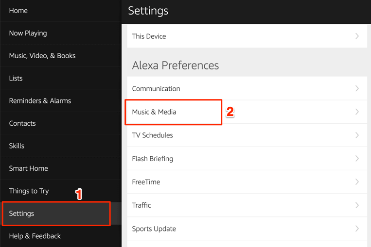 - Visita l'App Alexa () sul tuo browser web. Apri ilImpostazionimenu e selezionareMusica e medianella sezione “Preferenze Alexa”.