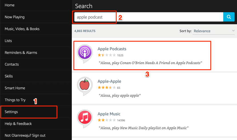 - Apri l'App Alexa () sul tuo browser web e accedi al tuo account Amazon. SelezionareImpostazioninel menu, digitarepodcast di melenella barra di ricerca e scegliPodcast di Applenei risultati.