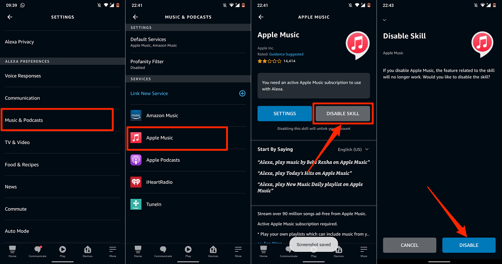 Apri il menu delle impostazioni dell'app Alexa, selezionaMusica e podcast, selezionaApple Musica, rubinettoDisabilita abilitàe selezionareDisabilita.