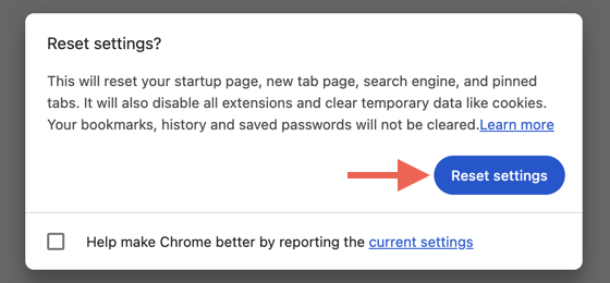 Se nessuna delle soluzioni precedenti funziona, potrebbe essere necessario reimpostare Chrome. Questo processo elimina automaticamente la cache del browser, disabilita tutte le estensioni e ripristina le impostazioni predefinite di fabbrica. I segnalibri e le password salvati rimarranno intatti.