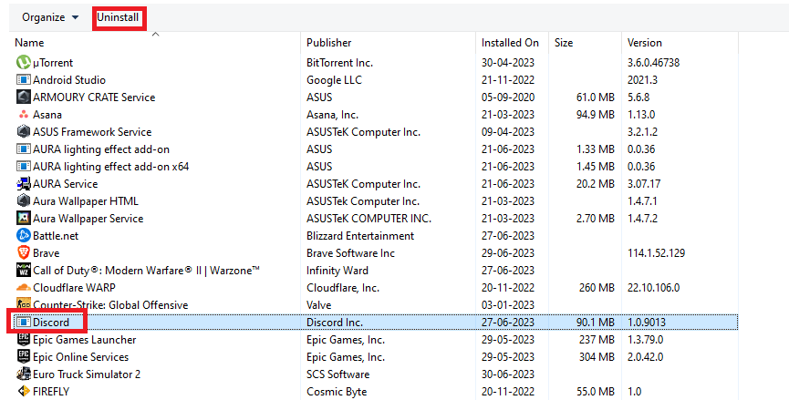 3.SelezionareDiscordiae fare clic suDisinstallarepulsante.