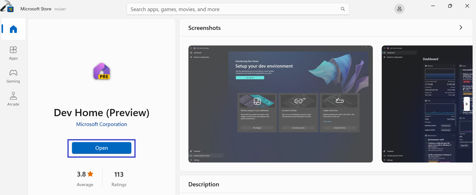 4. Dopo aver installato l'app Dev Home, fai clic su "Aprire“.