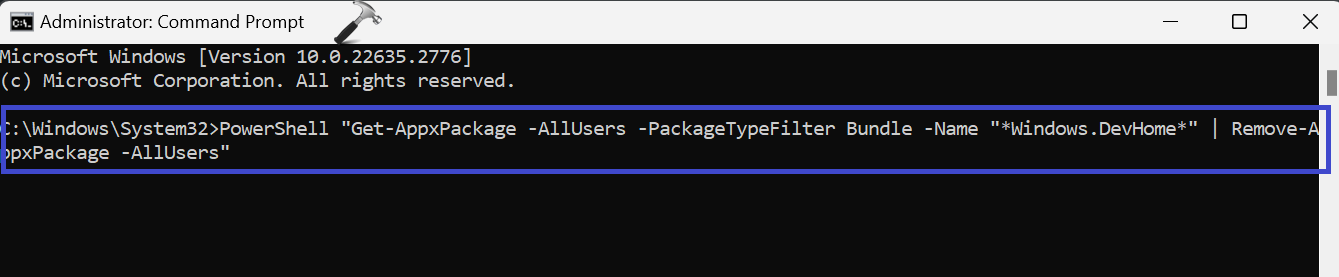 PowerShell "Get-AppxPackage -AllUsers -PackageTypeFilter Bundle -Name "*Windows.DevHome*" | Remove-AppxPackage -AllUsers"
