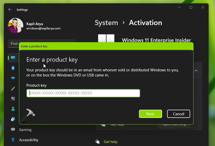 3.Fare clic suModificaaccanto a Cambia codice prodotto. Digitare il codice Product Key generico di Windows 11 Enterprise Edition come segue e fare clic su Avanti, quindi su Attiva.