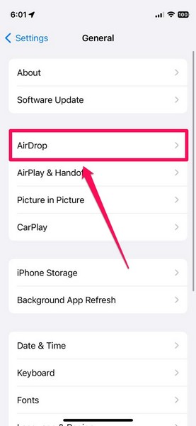 3.Nella pagina successiva, toccare ilAirDropopzione per aprire le sue impostazioni.