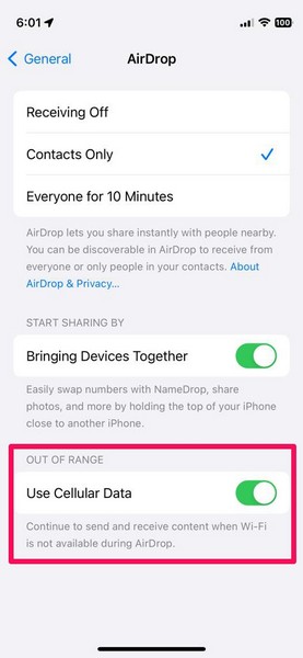 Con il nuovo interruttore Usa dati cellulare abilitato per AirDrop sul tuo iPhone, sarai in grado di inviare o ricevere file tramite AirDrop da o verso dispositivi fuori portata. Quindi sì, ecco come puoi utilizzare la nuova funzionalità AirDrop su Internet sul tuo iPhone in iOS 17.1.