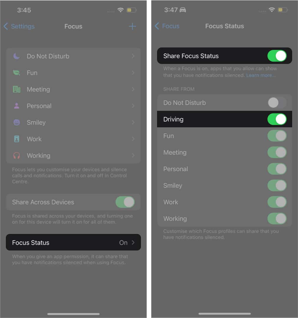 Puoi far sapere agli altri che stai guidando condividendo uno stato Focus. Ciò farà sapere agli altri che hai silenziato le notifiche. Apple ha modificato l'impostazione con iOS 16 poiché lo stato Focus ora ha una sezione separata.