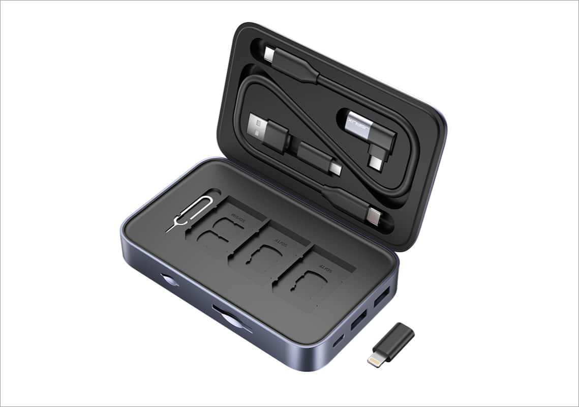 Come accennato in precedenza, Omnicase 2 Pro è un organizer per accessori che puoi utilizzare per disporre correttamente le schede di memoria e i cavi. L'apertura del dock rivelerà tutte le opzioni di archiviazione per organizzare cavi e schede. Inoltre, ecco tutto ciò che ottieni con Omnicase 2 Pro: