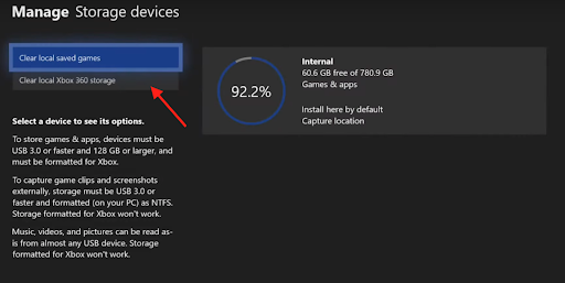 - SelezionareCancella i giochi salvati localiECancella spazio di archiviazione Xbox 360 locale.