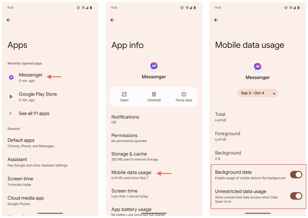 Per abilitare le autorizzazioni dati per Messenger su Android: