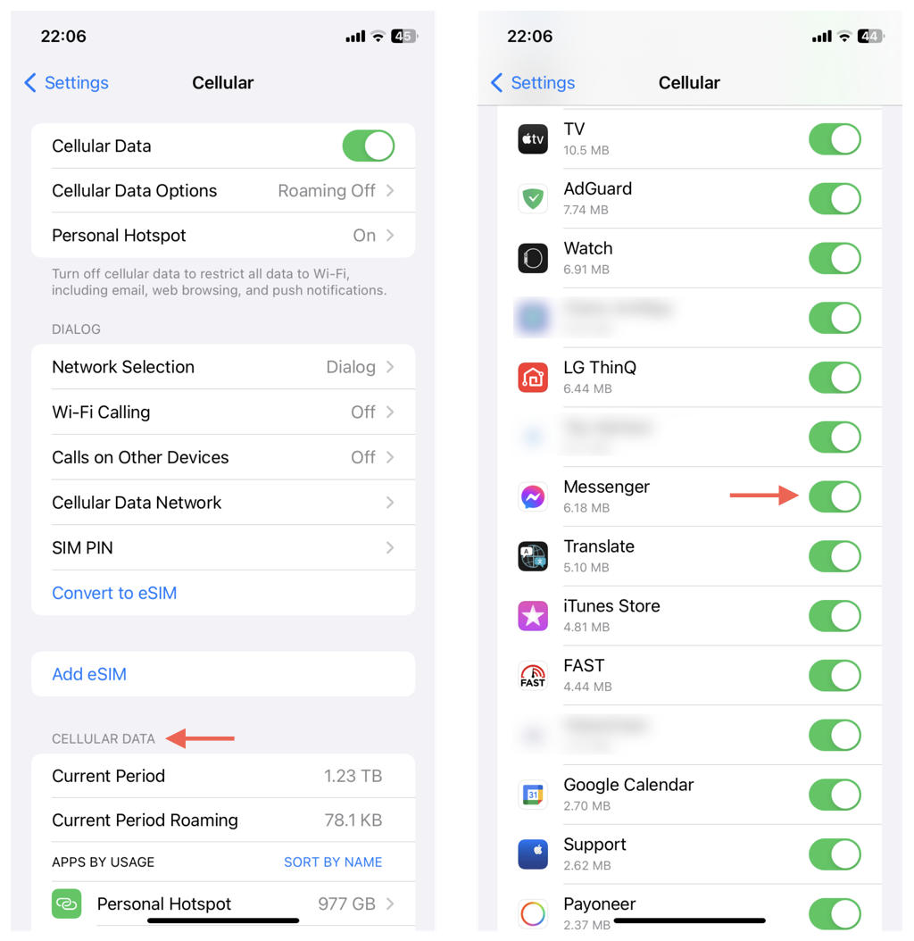 - SottoDati cellulari, individuareMessaggeroe attiva l'interruttore accanto ad esso.