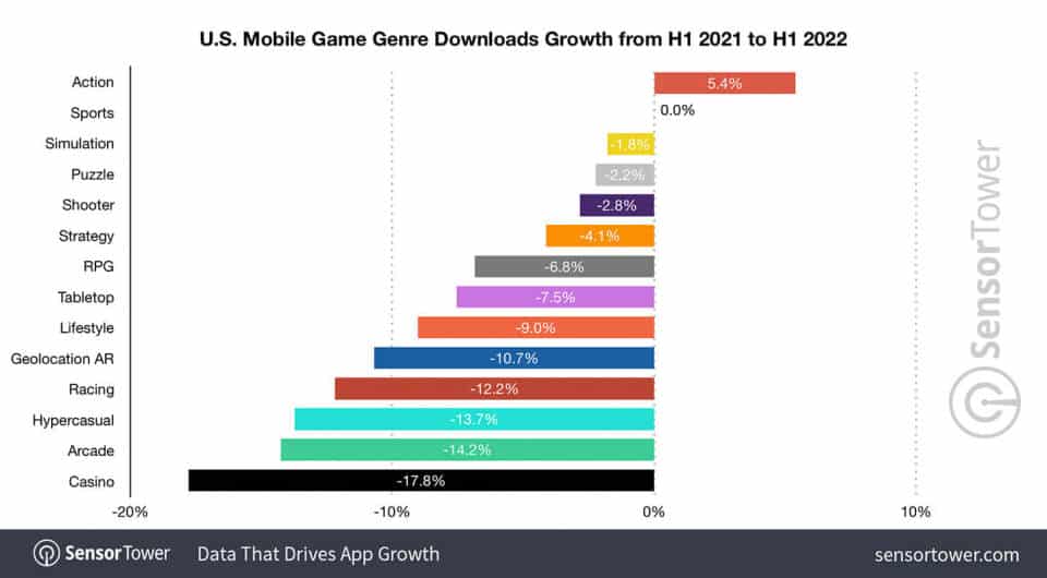 Secondo i dati raccolti daTorre dei sensori, il mercato dei giochi per dispositivi mobili è sceso del 9,6% su base annua a 11,4 miliardi di dollari. L'azienda ha analizzato 14 generi di giochi principali nel primo semestre del 2022 rispetto al primo semestre del 2021, esaminando entrate e download in ciascuna categoria su App Store e Google Play.
