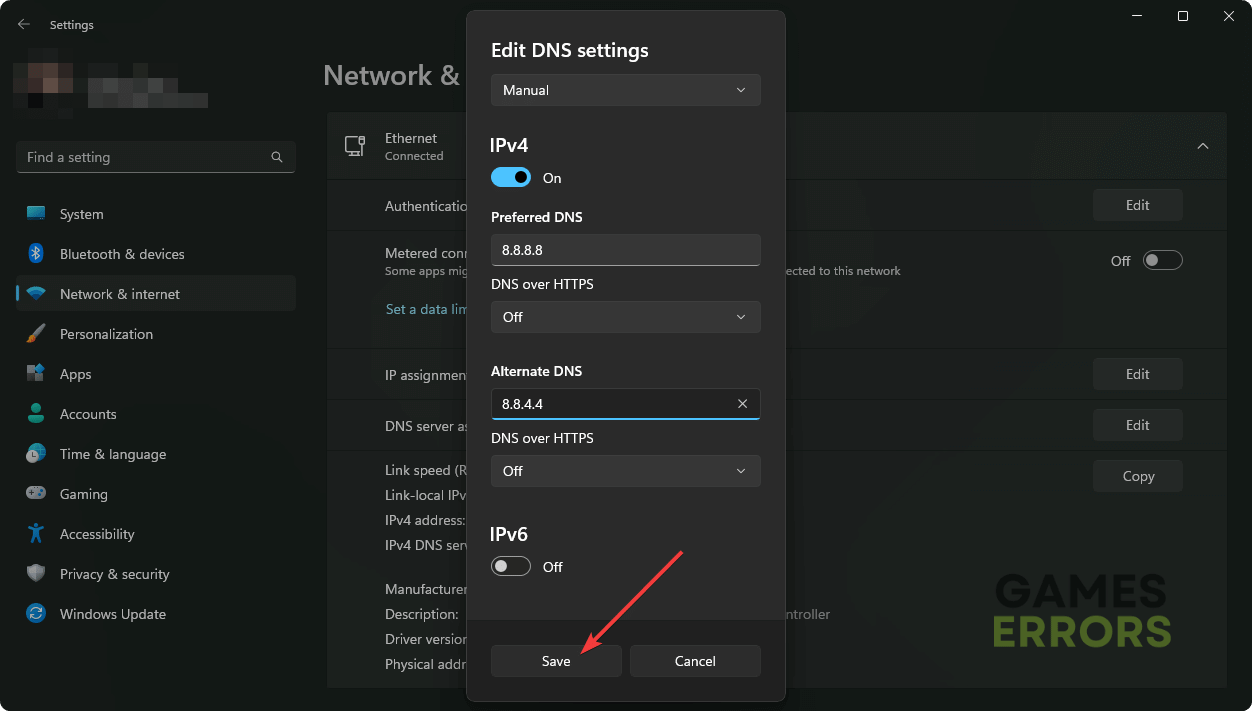 - Imposta il DNS preferito e alternativo come8.8.8.8E8.8.4.4e quindi fare clic suSalva.
