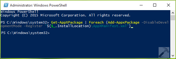 Get-AppXPackage | Foreach {Add-AppxPackage -DisableDevelopmentMode -Register "$($_.InstallLocation)AppXManifest.xml"}
