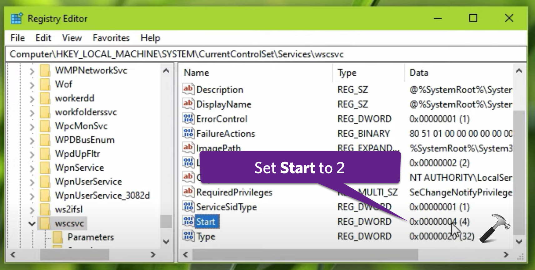 - Nella chiave di registro wscsvc troveraiInizioDWORD del registro (REG_DWORD) impostato su 4 valori di dati. Fare doppio clic sulla DWORD e impostarne il valore2.