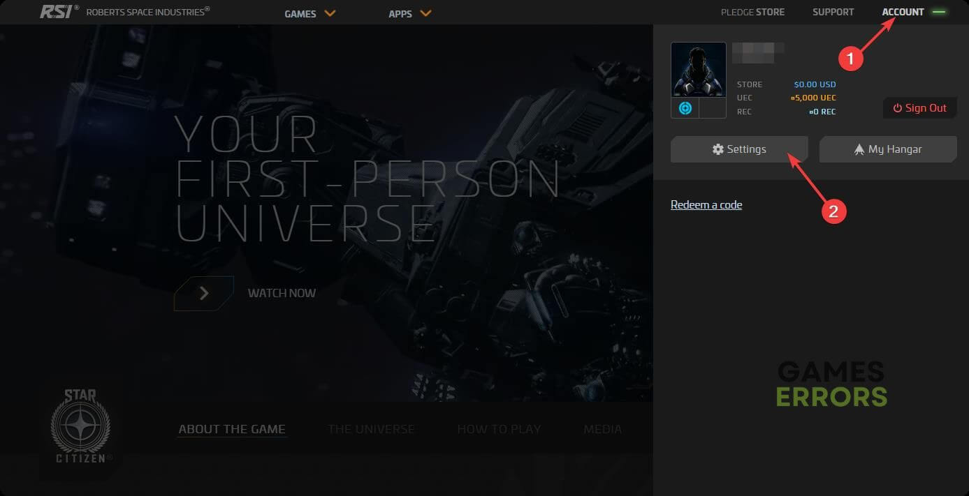 1. Visita ilSito web di Star Citizen, fare clic suAccounte accedi con le tue credenziali.