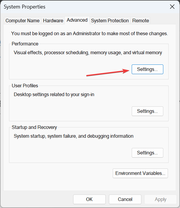 Passaggio 4:Fare clic sul pulsante Impostazioni in Prestazioni.