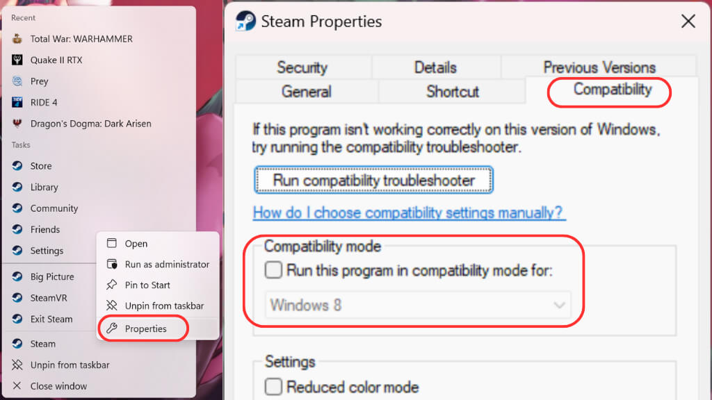 Trova il collegamento Steam, fai clic con il pulsante destro del mouse, selezionaProprietà, PoiCompatibilità.