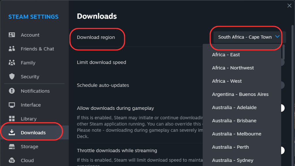 Nota:La modifica di queste impostazioni sìnoncambia la regione del tuo negozio Steam, solo il server da cui vengono scaricati i tuoi giochi.