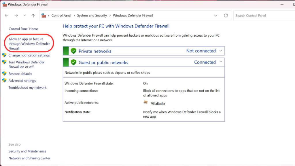 - Sul lato sinistro vedrai un elenco di opzioni; scegliereConsenti un'app o una funzionalità tramite Windows Defender Firewall.