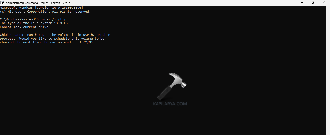Passaggio 3-Ora, il comando CHKDSK analizzerà qualsiasi errore del disco e lo riparerà. Ancora una volta, se richiede di pianificare un controllo del disco la prossima volta, premi Y sulla tastiera. Successivamente, premi Invio e riavvia il PC per consentire l'esecuzione del comando CHKDSK.