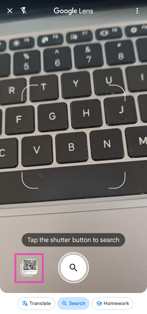 Avvia l'app della fotocamera e fai clic sull'icona del codice a barre sotto il pulsante di scatto. Sposta il codice QR davanti alla fotocamera per scansionarlo.