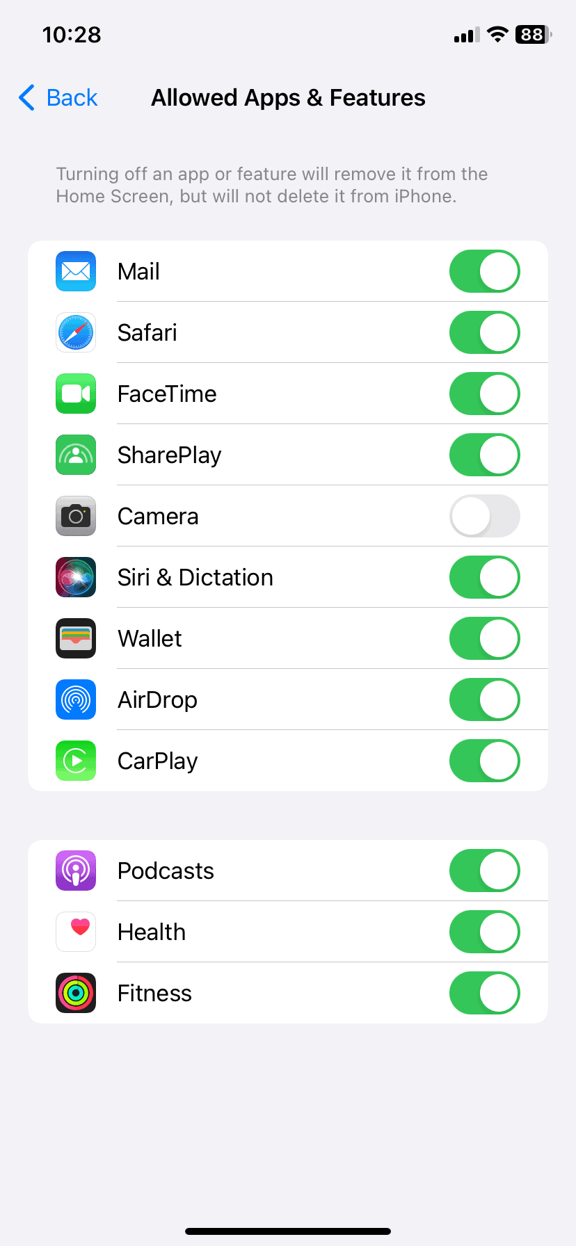 - Scorri verso il basso e attiva l'interruttore accanto aTelecameraper disabilitarlo.