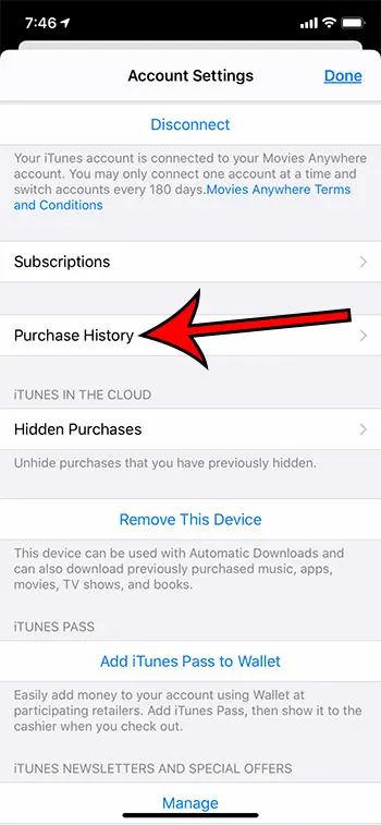 Passaggio 4: scorri verso il basso e toccaCronologia acquistipulsante.