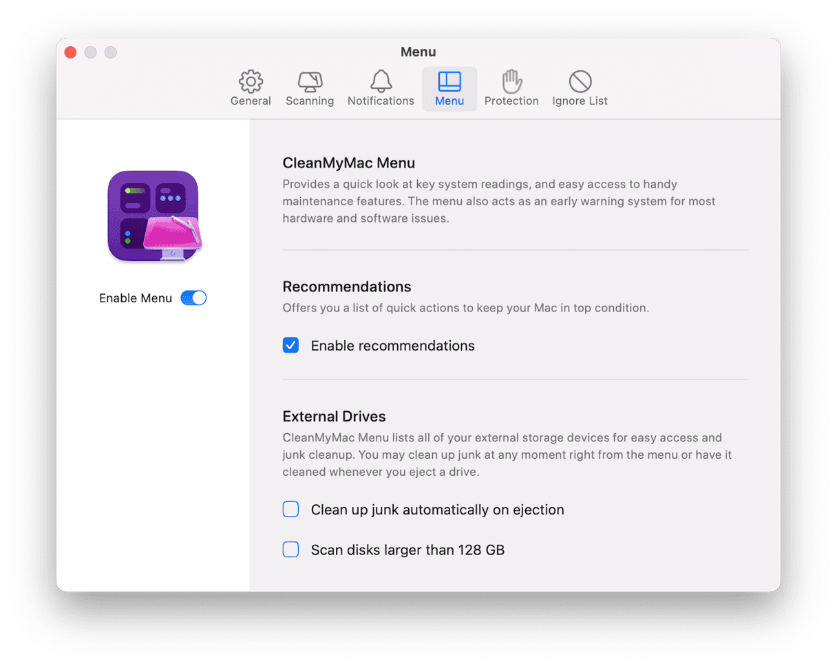 Se, per qualche motivo, non riesci a vedere l'icona di iMac nella barra dei menu, apri CleanMyMac e vai su Impostazioni > Menu per abilitarla.