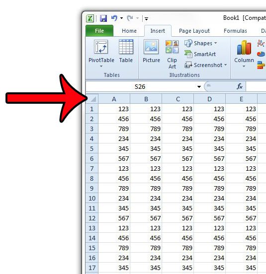 Passaggio 2: fai clic sul pulsante nell'angolo in alto a sinistra del foglio di calcolo (la cella tra il file1e ilUN) per selezionare l'intero foglio di lavoro. Se desideri rimuovere i bordi solo da una parte del foglio di calcolo, seleziona invece quelle celle. Puoi selezionare un'intera riga o colonna facendo clic sul numero di riga sul lato sinistro del foglio di calcolo o sulla lettera della colonna nella parte superiore del foglio di calcolo.