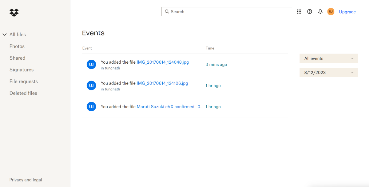 Potrai visualizzare la cronologia del tuo account Dropbox. È possibile visualizzare il registro eventi per una particolare cartella utilizzando il menu a destra. Puoi anche impostare una data particolare per visualizzare gli eventi di quel particolare giorno.