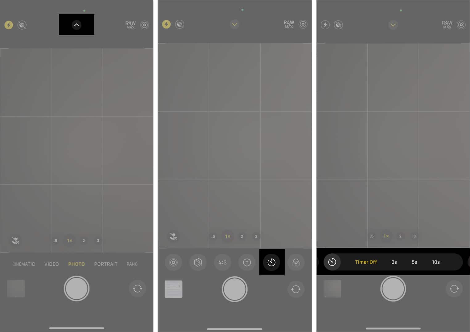 Para usar o temporizador da câmera do iPhone, abra oCâmeraaplicativo e deslize para cima. Agora, na nova bandeja de opções, toque notemporizadorícone. Agora você pode escolher entre3s,5s, ouAtraso de 10s. Configure sua foto, aperte o botão do obturador e a câmera fará uma contagem regressiva antes de tirar a foto.