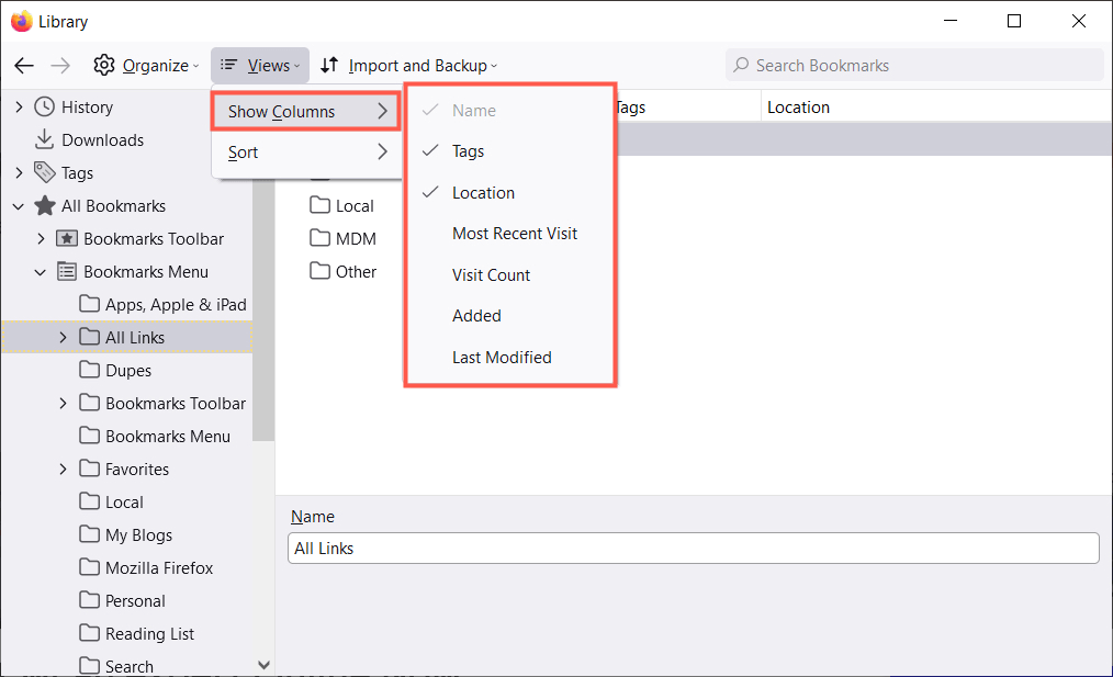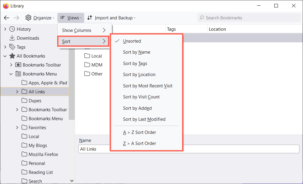 Você pode então classificar os favoritos usando o mesmoVisualizaçõesbotão na barra de ferramentas. Escolha uma opção de classificação no menu pop-out. Como alternativa, você pode selecionar um cabeçalho de coluna para classificar por essa coluna específica.